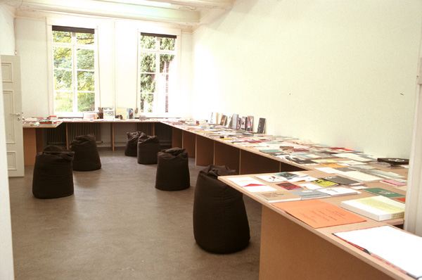 "Kiosk" exhibition held at Marres 06.09.02-15.10.02 Exhibition design and furniture for Marres and the "Kiosk" archive of contempory art by Revolver Publishing. Commissioned by Frederique Bergholtz. Display for this traveling archive of contemporary independent art publishers in Marres, Maastricht. For this exhibition Manuel split the archive according to the four rooms which were available, the order was dummies, magazines, books, audio and video. Each room was fitted with tables, having different reading heights, suggesting various speeds of reading, for example magazines at a bar height, books at a regular table height. The tables ran through the entire gallery space as one continuous line, fitted to the walls and doors. Lounge- and sitting- bags, specifically produced for this exhibition, the sitting bags can be used for normal upright sitting, as well as thrown flat on the floor to sleep on them. |