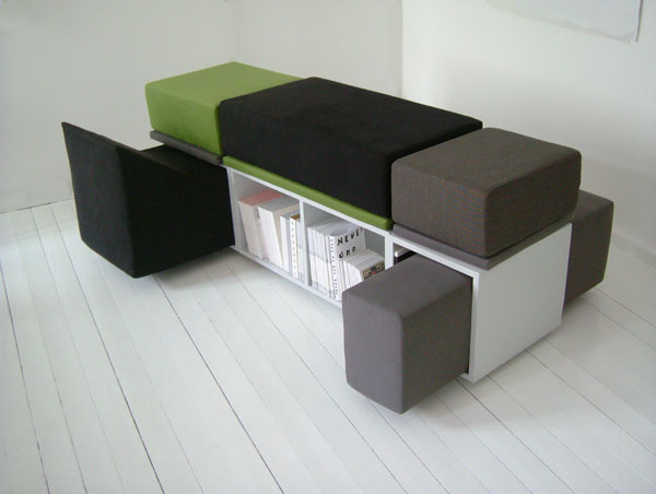 The cushions can also be used to fill up empty spaces where no books are placed and function as connectors between the single devices. The sidewalls of the chairs are magnetic.