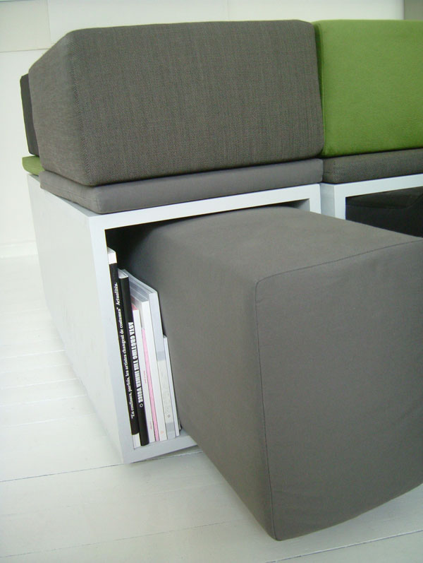 | Furniture made for storing your personal archive and books, allowing chairs to connect with each-others or as fragmentary sitting devices. Chair, comes in three pieces with various cushions. The cushions can also be used to fill up empty spaces where no books are placed and function as connectors between the single devices. The sidewalls of the chairs are magnetic. |